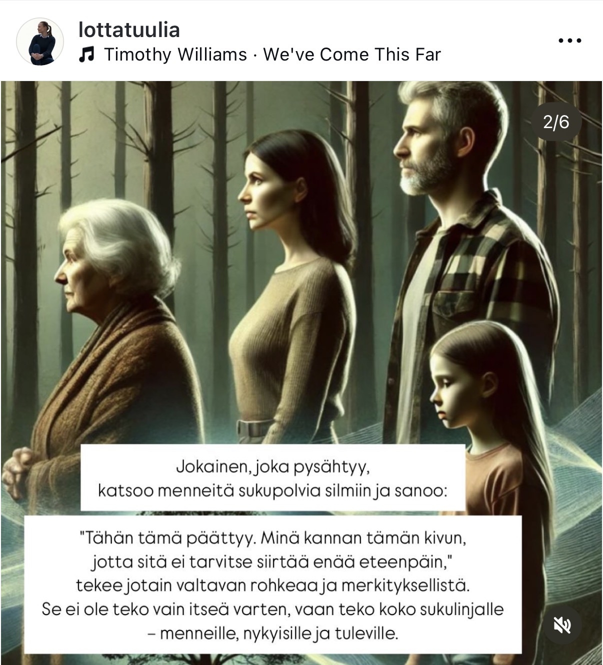 Syklin murtaminen ei ole kapinaa. Se on syvää rakkautta. Halua katsoa sitä, mitä aiemmat sukupolvet eivät voineet tai uskaltaneet katsoa.