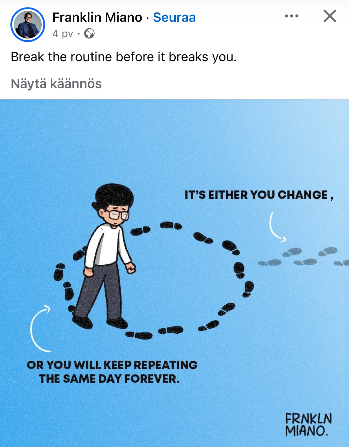 Työelämän rytmissä luovuudelle ei kuitenkaan tuntunut jäävän enää tilaa. Tilalle tuli suorituskeskeinen elämä, joka tuntui ikuiselta projektilta ja excel-taulukolta: aina jokin seuraava tehtävä, aina jokin seuraava tavoite, aina jokin seuraava “pitää” ja “täytyy”.