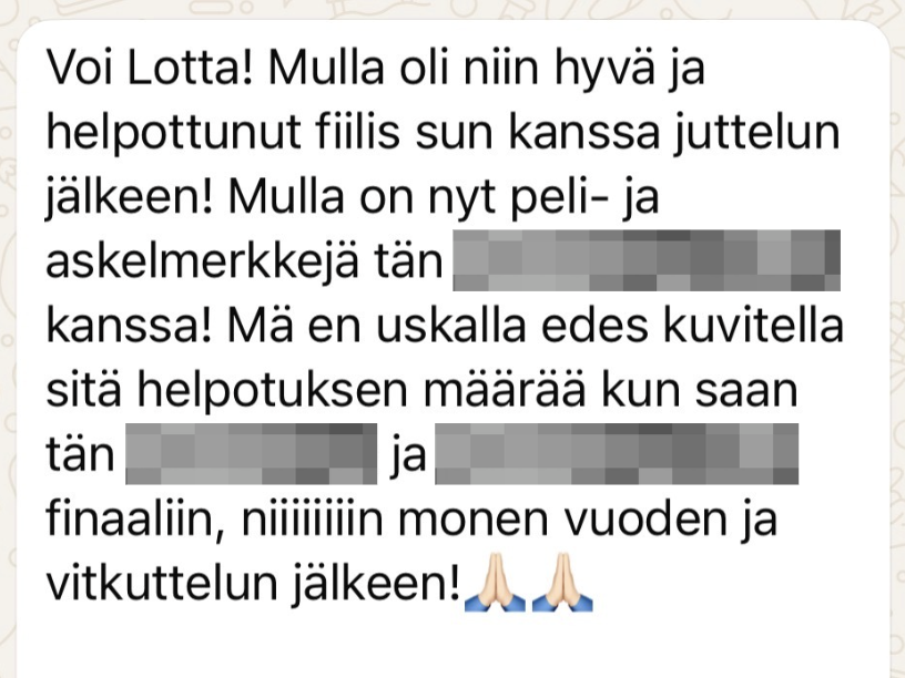 Lotan tarjoama ammattimainen tuki on ohjannut minua hellästi ja ilon kautta eteenpäin ja jokaisen tapaamisen jälkeen olen ollut pöllämystyneen kiitollinen siitä, mihin psyykeni syvyyksiin olen saanutkaan sukeltaa."