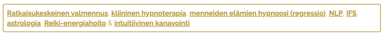 Sinun ei tarvitse koskaan etukäteen pohtia, “teemmekö tänään hypnoosia vai coachingia”. Minä tunnustelen, mitä juuri nyt tarvitaan, ja rakennan sinulle turvallisen, sinun prosessiasi tukevan ja sitä eteenpäin vievän kokonaisuuden.