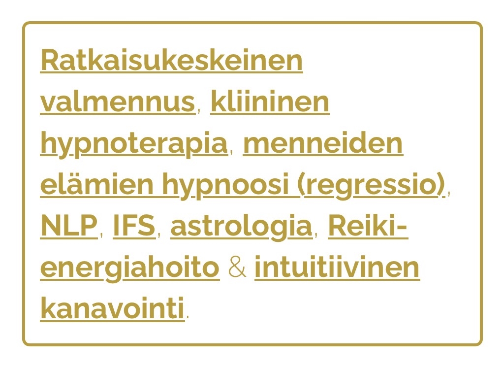 Hyödynnän työskentelyssäni erityisesti coachingia, NLP:tä ja hypnoosia – aina tilanteesi ja tarpeesi mukaan.