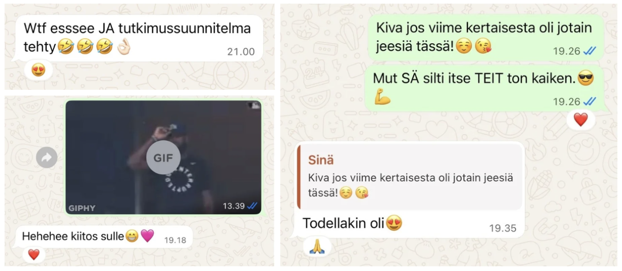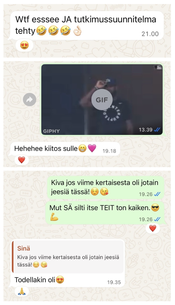 Voit laittaa viestiä (mieluiten WhatsAppissa) tai soittaa – sen mukaan, mikä tuntuu sinulle luontevimmalta.